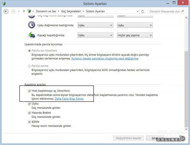 Güç seçenekleri > Uyanırken parola gerektir yolunu izleyin ve