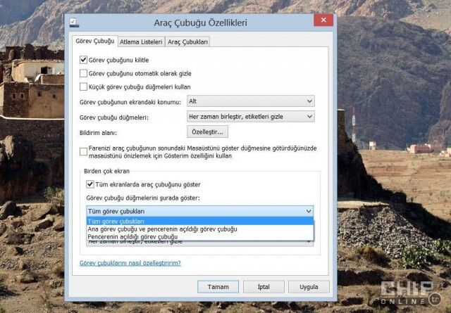 Windows 8, çift monitörlü sistemler için kapsamlı seçenekler sunuyor. Örneğin görev çubuğunun özelliklerine giderek açık programların görev çubuğu simgelerinin hangi monitörde görüntüleneceğini seçebilirsiniz.