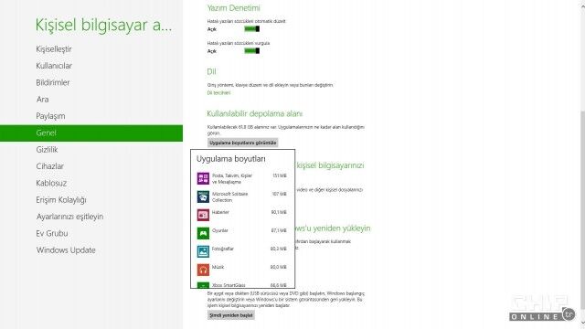 Sisteminizdeki Windows 8 uygulamalarının boyutlarını görmeniz mümkün. Bunun için Bilgisayar Ayarlarını Değiştir ekranını açın ve Genel sayfasına gidin. Sağ taraftan