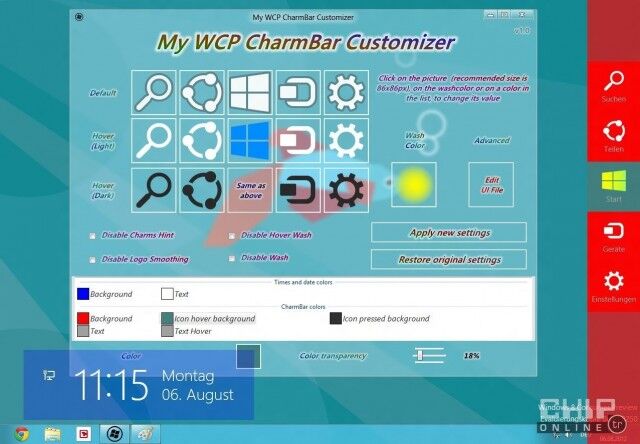 Windows 8'in Charms çubuğundan daha fazlasını elde etmek için ücretsiz My WCP CharmBar Customiser'dan faydalanabilirsiniz.