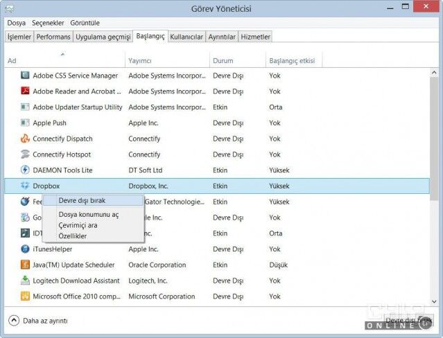 Hızlı başlangıç için gereksiz başlangıç öğelerinizi temizlemeniz, Windows 8'de de gerekli. Yeni Windows'ta bu işi Görev Yöneticisi içerisindeki Başlangıç sekmesinden gerçekleştirebilirsiniz. Sisteminizle birlikte otomatik olarak başlayan programları, onlara sağ tıklayarak devre dışı bırakabilirsiniz.